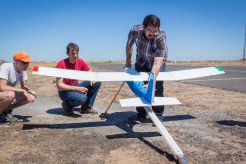 For one certification, Stark and Professor YangQuan Chen selected a fiberglass plane with a 7 ½-foot wingspan that flies for about 45 minutes at a stretch and can carry 2 pounds of scientific equipment, such as environmental sensors and cameras for this permit. They have authorization to launch from a site within a few miles of campus and can fly it up to 700 feet in the air.